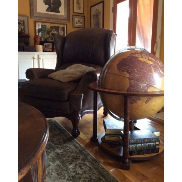 Magnifique réalisation artisanale, ce grand globe terrestre surprend par ses teintes bois parfaitement accordées avec les couleurs contemporaines de sa cartographie.