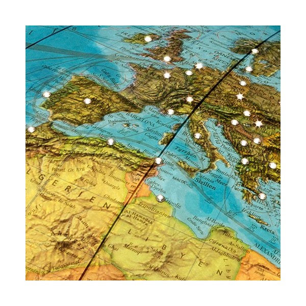 La carte politique * est visible lorsque que le globe Columbus est éteint. Elle laisse apparaître les pays de la terre en différentes couleurs afin de pouvoir les différencier facilement tout en procurant une vision de la terre proche de celle d’une photographique.